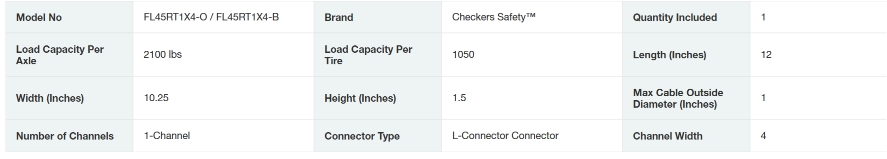 Use 1-Channel Fastlane® Drop-Over Cable Protector 45 Degree Right Turns with FL1X4 Series. Fastlane® lightweight drop-over protectors are made from durable polyurethane and feature heavy-duty, patented L-Connectors for easily attaching additional protectors to extend to any desired length. Patented 5-bar tread plate surface provides maximum traction for carts and pedestrian traffic. These low profile protectors fit multiple cable sizes up to .5 inches tall and are compact for easy setup, disassembly, and storage.