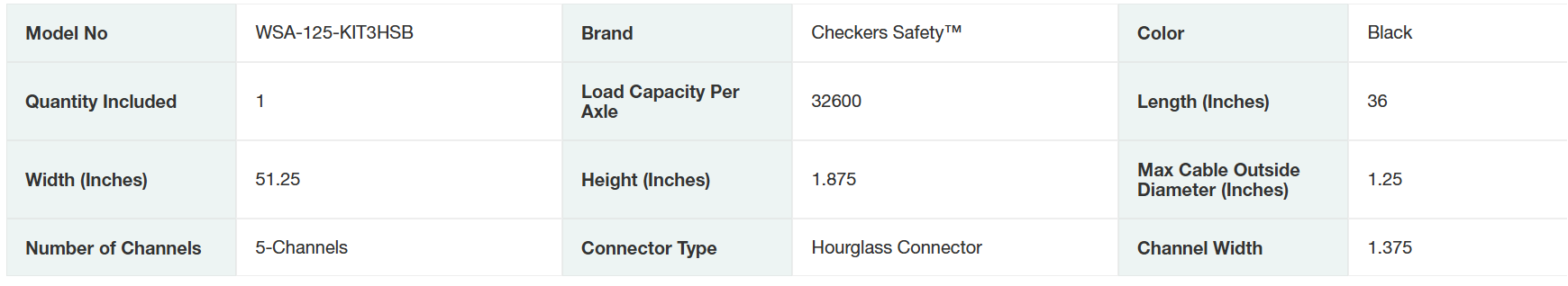 5-Channel Yellow Jacket® AMS® (Advanced Modular System) Accessibility Ramps Kit 3 in black, model WSA-125-KIT3-HSB, features a gradual slope and slip-resistant surface to ensure a safe crossing point over cable protectors for carts, forklifts, vehicles with small wheels and heavy trucks. In addition, each Checkers™ Accessibility Ramp system is manufactured to meet ADA and DDA compliant specifications.