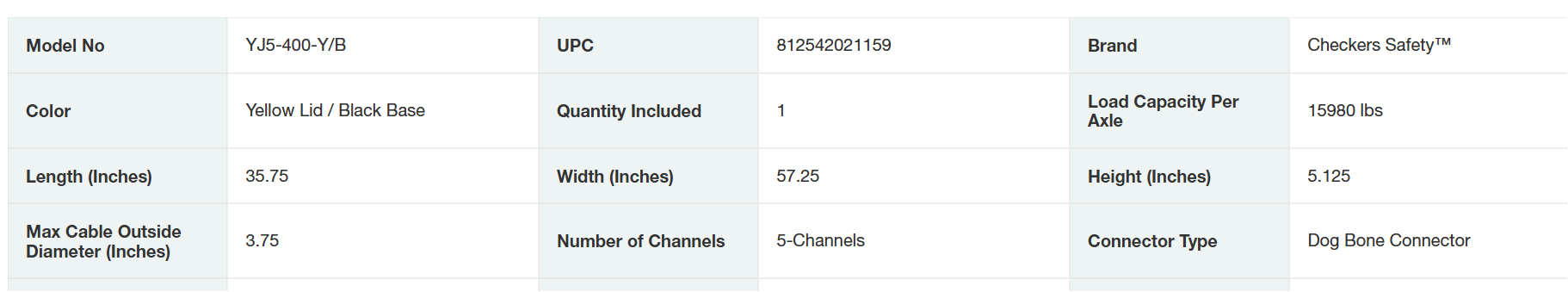 Yellow Jacket® 5-channel cable protector with hinged lid provides a safe crossing in high volume traffic areas while protecting valuable electrical cables and hose lines from damage. Heavy-duty modular interlocking design is ideal for use in industrial, commercial, and public applications.