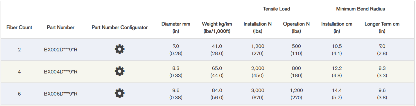 CABLE CHARACTERISTICS: B-SERIES BREAKOUT RISER CABLES (WITH 2.5MM SUBCABLES)