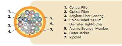 This plenum distribution fiber cable is used in trunking, LAN and distribution applications where small size, lightweight, and versatile installation capability are required for ducts, plenums, and air handling spaces. It's ideal for configurations requiring a single termination point with multiple fibers. The plenum distribution fiber optic cable uses high performance components and construction and is UL Listed in accordance with NEC section 770.179(a) for use in ducts, plenums and air-handling spaces.