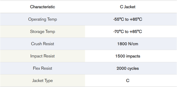 - Tactical Polyurethane (C) outer jacket material is standard; Flame-Retardant Tactical (V) and Low-Smoke Zero-Halogen (G) outer jacket materials are available