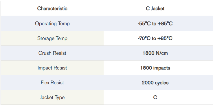 - Tactical Polyurethane (C) outer jacket material is standard; Flame-Retardant Tactical (V) and Low-Smoke Zero-Halogen (G) outer jacket materials are available