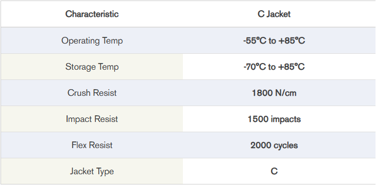 - Tactical Polyurethane (C) outer jacket material is standard; Flame-Retardant Tactical (V) and Low-Smoke Zero-Halogen (G) outer jacket materials are available