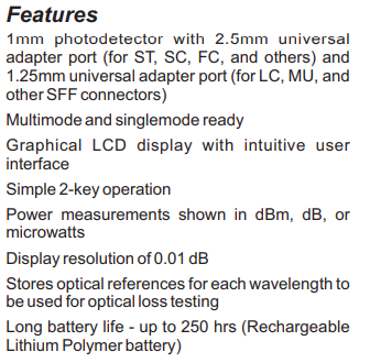 The ZOOM 2 is a high accuracy, high resolution,microprocessor controlled, optical power meter. It has a 65dB dynamic range, and is calibrated at 850, 1300, 1310,1490, and 1550nm, making it ideal for both singlemode and multimode fiber testing, including Fiber To The Home (FTTH) PON networks. It is enclosed in an attractive handheld case with a graphic liquid crystal display, and 2-key keypad for easy operation. Its 2.5mm universal fiber connector port allows connection to ST, SC, FC, and other popular 2.5mm ferrule connectors, will operate for over 250 hours on its internal high-capacity rechargeable Lithium Polymer battery, and has built-in auto shutdown. Reference values for each calibrated wavelength can be stored in permanent memory for quick and simple optical loss measurements.